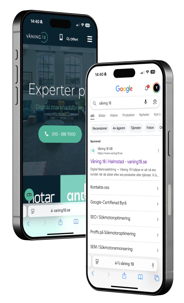 Med 50 anställda fördelat på ett kontor i Halmstad och ett i Göteborg, blir man ett gäng digitala nördar med att starkt driv att ta våra kunder i handen och hjälpa dem att växa sin digitala närvaro. Där målet alltid är att kunderna får er positiv utveckling som går i linje med de gemensamma förväntningarna. Så att löpande följa upp resultat och åtgärder tillsammans med kund blir den stor del av ett SEO projekt hos Våning 18.